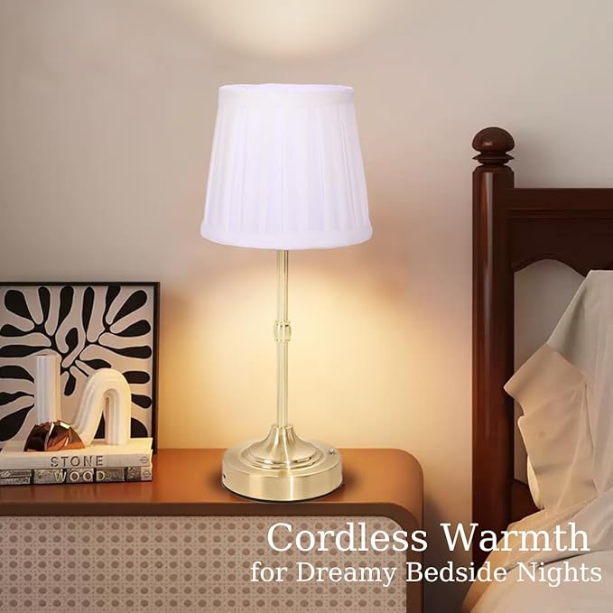 Cordless Lamp, Rechargeable Battery-Operated Lamp with Fabric Lampshades, 2 Pack Dimmable Desk Lamps for Kitchen, Bedroom, Living Room, Nightstand, Balcony, Home Décor (Gold-Pleated)