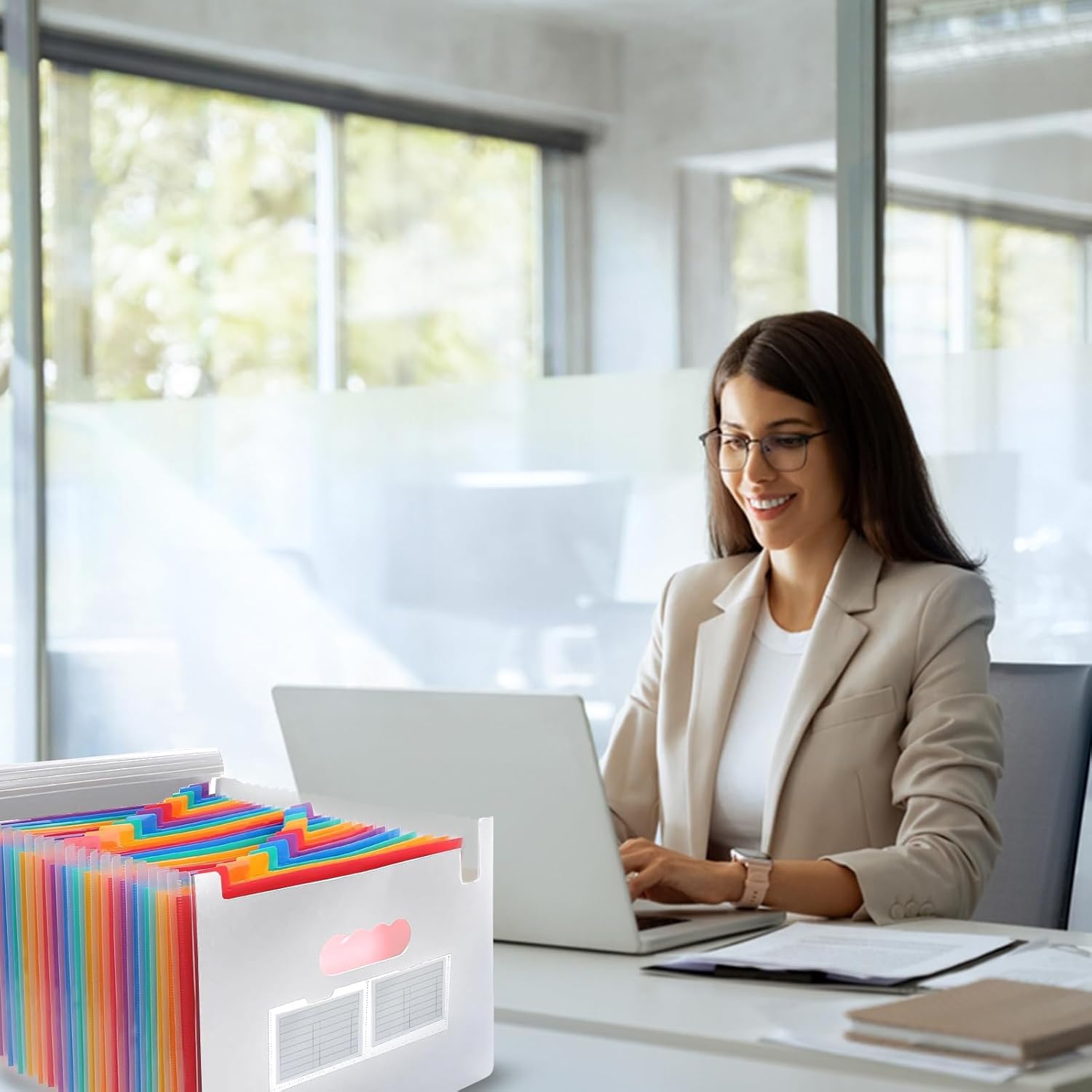 - Portable and StylishοΌOur folders with pockets feature a rainbow-colored design, which is stylish and beautiful. The lightweight file box can be compressed to a minimum thickness of 1.5β, and can be easily stored in a filing cabinet when closed. Handles on both sides enable easy gripping and carrying, making it ideal for transport between workplaces