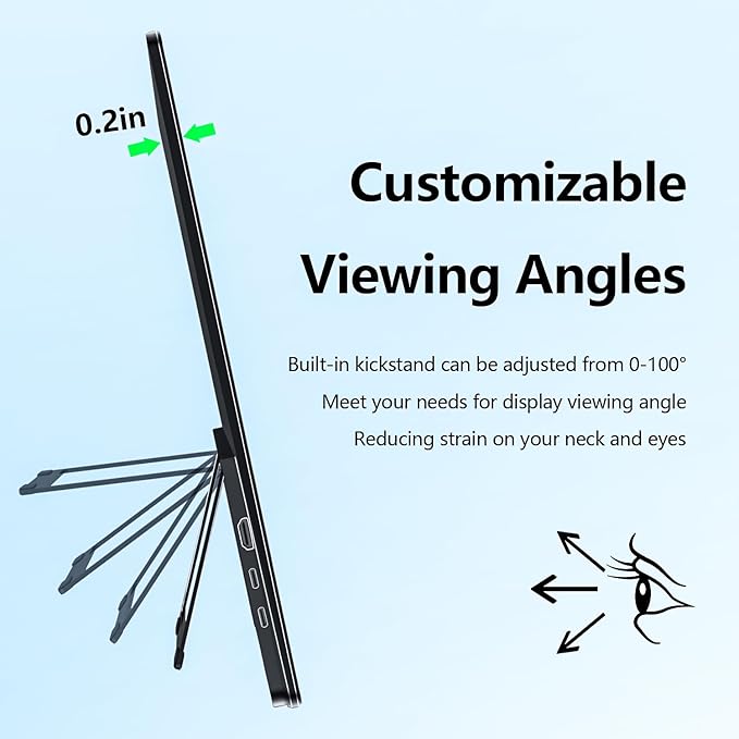 - 【24-inch Super Slim Portable Monitor with 110° Smooth-Adjust Stand】Supports seamless tilt adjustment from 0° to 110°, with a stand that enables vertical orientation—perfect for professionals who need portrait-mode viewing. The 24-inch screen provides ample display space while remaining portable, ensuring high-quality visuals whether at the office, at home, or on the move.