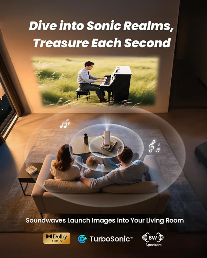 - 【Powerful 8W Turbo Sonic Bass with Dolby Audio】Turn your living room into a mini theater. Equipped with a high-performance 8W Turbo Sonic speaker and Dolby Audio, the T1 Pro mini projector delivers deep bass and crystal-clear sound that fills your space. With HDMI ARC support, you can easily connect it to your home theater system for an even more immersive experience. Besides, the portable projector doubles as a portable Bluetooth speaker. Imagine that you’re relaxing on your sofa while the T1 Pro plays your favourite playlist. What a cozy moment.:)