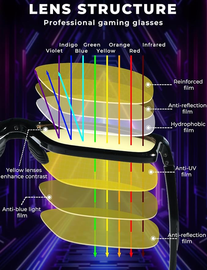 - Computer gaming glasses: Premium blue light blocking glasses specifically designed for gamers and daily computer users, filtering harmful blue light (380-400nm) to reduce eyestrain and fatigue during long gaming sessions. Provides 100% UV protection.