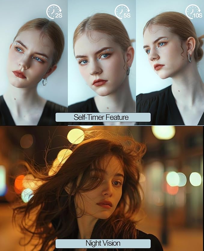 - 【Self-Timer Feature 】The Self-Timer on this camara fotografica sets a 3S/5S/10S delay for hands-free shooting, ideal for group photos, self-portraits, or tripod use to avoid shake, ensuring sharp 5K results.Other features: continuous shooting, filter shooting.