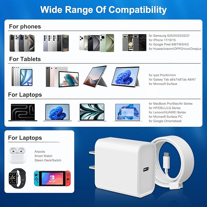- 【Wide Range of Compatibility for Type C Charger 】:Use the official USB-C cable 20W USB C wall charger to access fast-charging for iPhone 17/17 Pro/17 Pro Max/16/16 Plus/16 Pro/16 Pro Max/iPhone 15/15 Plus/15 Pro/15 Pro Max/ 2021/2020/2018 i Pad Pro 12.9/11 inch,i Pad Air 4, Mac Book Air 13 inch, Mac Book 12 inch, Gen 4/3, i Pad Pro 11 Gen 2/1, i Pad Air 4, Google Pixel 4/ 4 XL / 3a XL / 3 / XL / 2, Samsung Galaxy S8 S9 S10 S20 Plus, Note 10, LG and more.