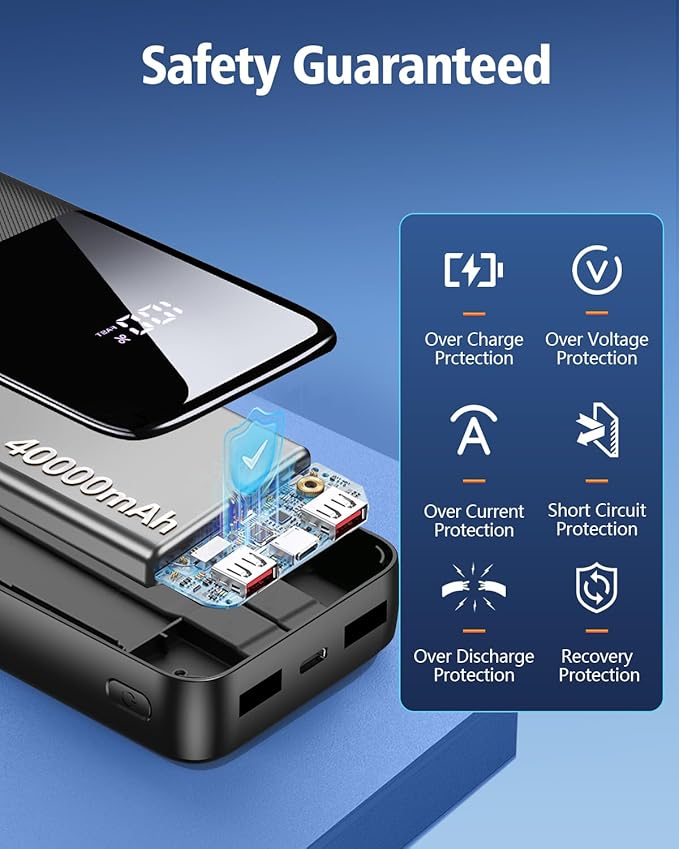 - Special Feature : Portable Charger Power Bank with Built-in Cables, Digital Display, 40000mAh, 22.5W QC4.0 Fast Charging, USB C Output, USB A Output, Charge 3 devices Simultaneously, Slim Size Portable Charger Power Bank with Built-in Cables, Digital Display, 40000mAh, 22.5W QC4.0 Fast Charging, USB C Output, USB A Output, Charge 3 devices Simultaneously, Slim Size