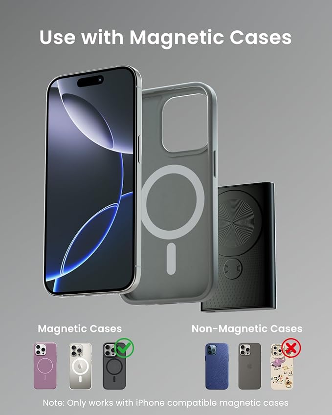 - MagSafe Portable Charger for iPhone 12-17 series: One-tap charging with 13N ultra-strong magnets and enlarged contact surface. Stays securely attached for single-handed selfies and smooth video calls. Maintains perfect charging even when moving around. (Note: It is normal for the power bank to reach temperatures between 98°F and 118°F when the ambient temperature is 77°F. Rest assured, this device complies with international safety standards for safe operation.)
