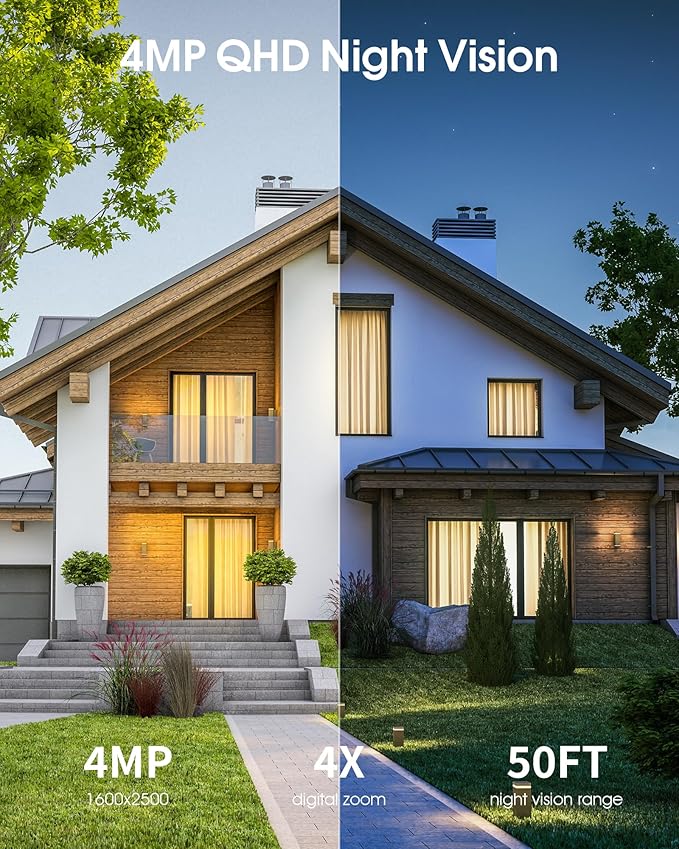 - 𝟒𝐌𝐏 𝐔𝐥𝐭𝐫𝐚 𝐇𝐃 𝐑𝐞𝐬𝐨𝐥𝐮𝐭𝐢𝐨𝐧 𝐰𝐢𝐭𝐡 𝐄𝐧𝐡𝐚𝐧𝐜𝐞𝐝 𝐍𝐢𝐠𝐡𝐭 𝐕𝐢𝐬𝐢𝐨𝐧: Captures crystal-clear 2560×1440p footage with 2× sharper details than 1080p. Advanced IR night vision provides 33ft visibility in complete darkness, while the optional color night mode delivers vivid nighttime images.
