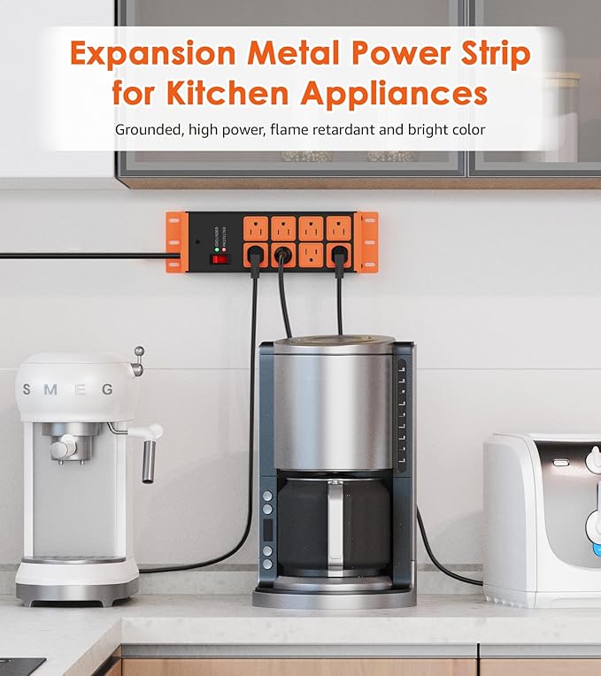 - Durable Housing - 8 outlet power strip surge protector - Thickened aluminum alloy shell and quality power modules, provides on/off switch with indicator light, fire retardant. suitable for small kitchen appliances as well as high power industrial equipment, more secure. And designed with bright orange element can make you can find it immediately!