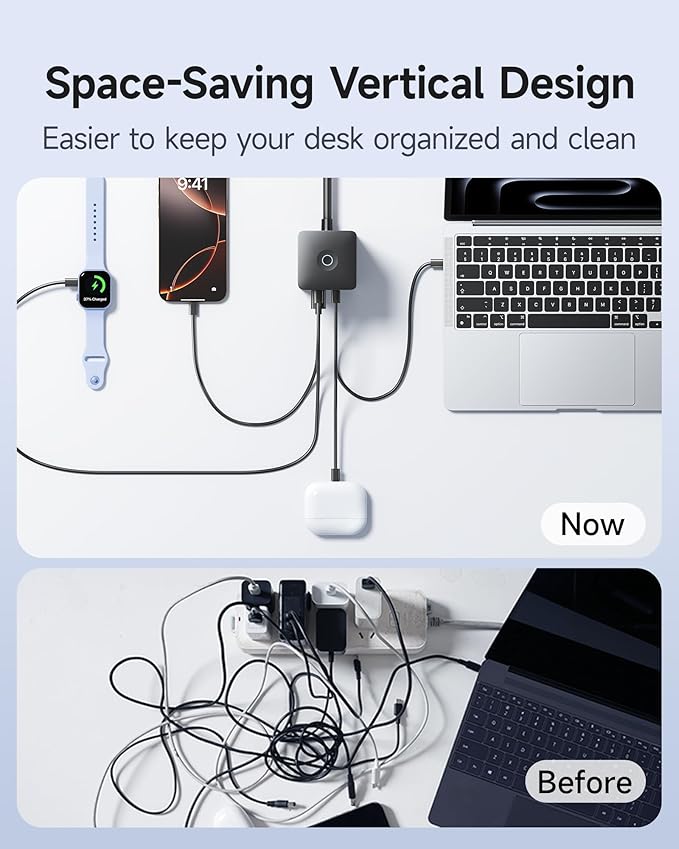 - Customized Stand Design for a Cleaner Workspace: Space-Saving Vertical Design for an Organized Workspace: The power strip stands stably at your desk without taking up too much space while charging up to 10 devices. Plug everything in it - it's easier to manage your cables.