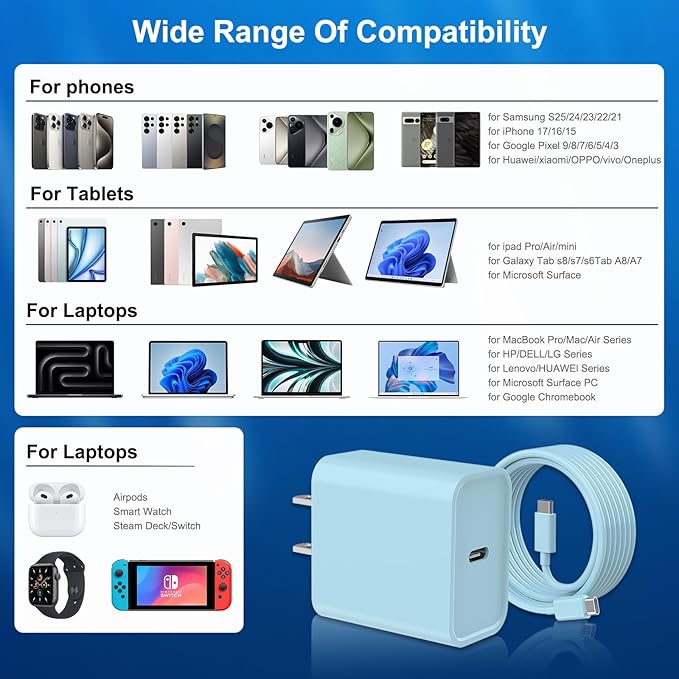 - 【Wide Range of Compatibility for Type C Charger 】:Use the official USB-C cable 20W USB C wall charger to access fast-charging for iPhone 17/17 Pro/17 Pro Max/16/16 Plus/16 Pro/16 Pro Max/iPhone 15/15 Plus/15 Pro/15 Pro Max/ 2021/2020/2018 i Pad Pro 12.9/11 inch,i Pad Air 4, Mac Book Air 13 inch, Mac Book 12 inch, Gen 4/3, i Pad Pro 11 Gen 2/1, i Pad Air 4, Google Pixel 4/ 4 XL / 3a XL / 3 / XL / 2, Samsung Galaxy S8 S9 S10 S20 Plus, Note 10, LG and more.