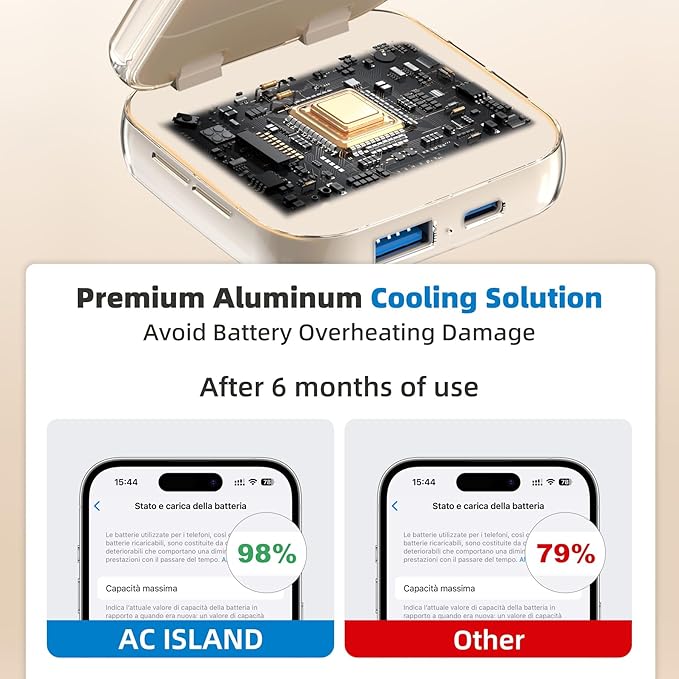 - Battery-Protective Aluminum Heat Dissipation: Designed for maximum thermal efficiency, this charger features an all-aluminum alloy body that dissipates heat over 60 times better than standard plastic housings. It protects your battery during multi-device charging by preventing overheating, ensuring fast, stable, and safe power delivery at all times.