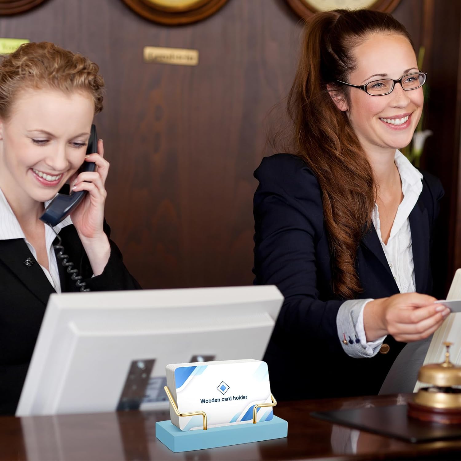 Amyhill 2 Pieces Wood Business Card Holder for Desk Wooden Business Card Display Stand Postcard Holder for Office Home Desktop (Blue Color, Gold)