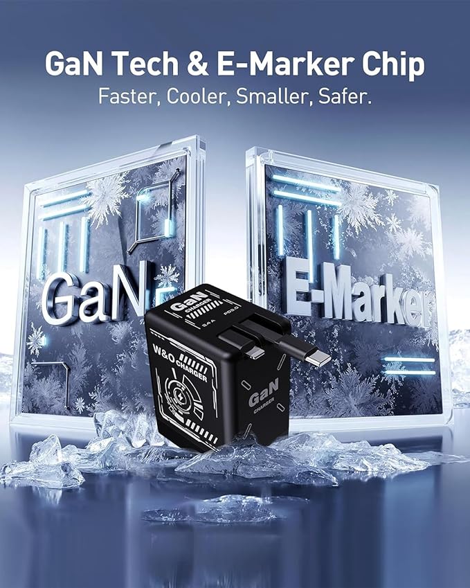 W & O 45W GaN Charger Fast Charger,Retractable Phone Charger Wall Plug with Lightening and Type-C Cables,for iPhone16/15/14/13/12/11 Series, Galaxy S25/24,Android and More(Black)