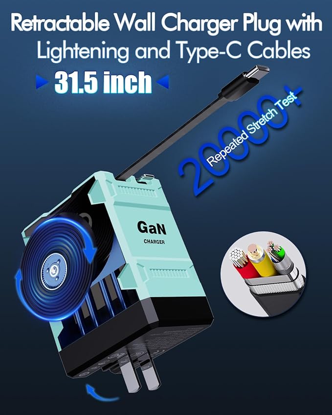 - Retractable Phone Charger with Dual Cables:Our iPhone charger fast charging comes with Type-C and Lightning cables that extend up to 31.5 inches. Tested over 20,000 stretches, the cables automatically retract for easy storage, keeping your kitchen, office, travel space, and bedroom clean and organized—no more tangled cables.