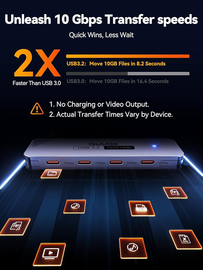 - USB-C 3.2 Gen 2 Hub: Achieve lightning-fast 10Gbps speeds (USB 3.2 Gen 2) across all 4 ports – transfer a 4K movie in 15 seconds or backup 100GB of photos in 90 seconds. Perfect for external SSDs, photographers, and video editors.