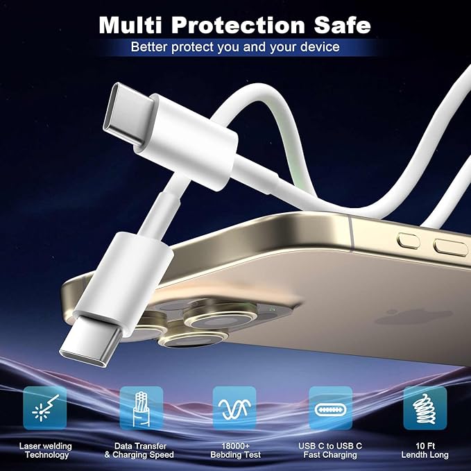 - 【What You Get】You Will Get 2Pack Super Fast Dual Port USB C Phone Charger iPhone 17 16 15 Pro Max Charger Fast Charging Block Plug and 2Pack Extra Long 10 FT Super Fast USB C to USB C Charger Fast Charging Cable Cord,12-Month Worry-Free Refund and Replacement Guarantee.if You Have any Questions,Please Feel Free to Contact us,we Have Confidence in our Products and we are Responsible to our Customers,We Promise to solve Your Problems Within 24 Hours.