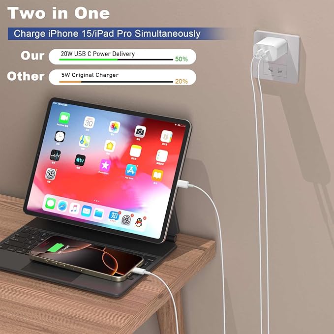 - 【Double USB C Phone Charger Fast Charging Block】20W Dual Port USB C Phone Charger Fast Charging Block Technology,Delivering a Maximum Charging Speed of Max for Your iPhone 17 16 15 Pro.Charging Your Up to 50% in Just 30 Minutes for iPhone 17 16 15 Pro Charging,Full Charger iPad Pro 12.9 in 2.5 Hours,This Powerhouse Charges Your Phone Up to 3 Times Faster than Standard Chargers,Making it an ideal match for iPhone 17 16 15 Pro More.