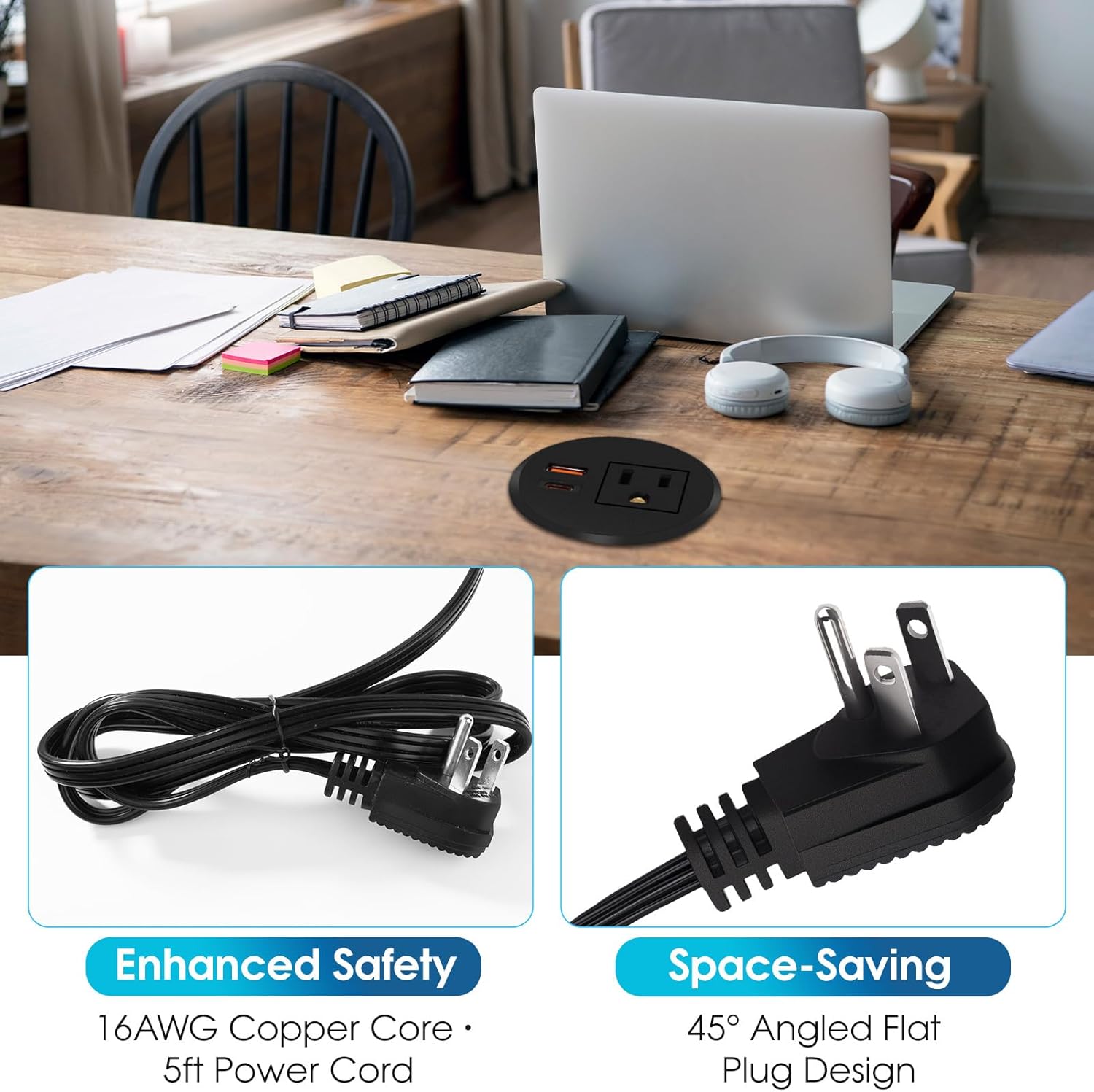 - DESK CHARGING STATION: Furniture power hub with 1 AC outlet + 2 fast-charging USB ports (18W USB-A & 20W USB-C), 5ft 16 AWG cord for reliable electrical connection