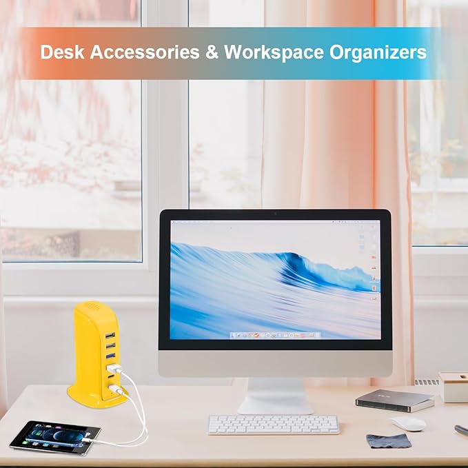 45W USB Charging Station, 6-Port Hub with 4 USB-A & 2 USB-C Ports, 5ft Cable, Yellow