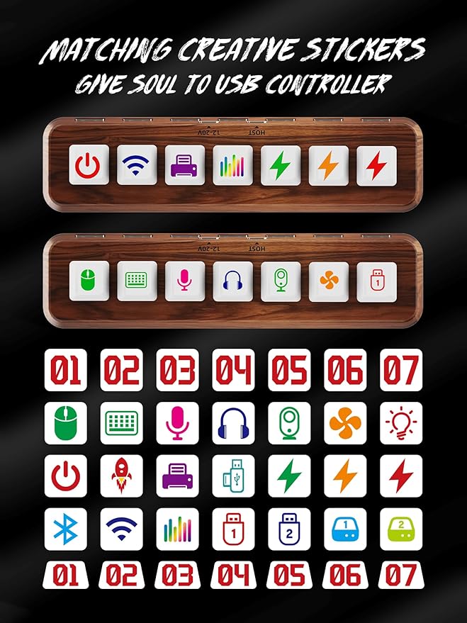 - 3. Hot swappable control switches: 7 switches independently controlling USB ports support DIY modification, compatible with mechanical keyboards similar Cherry MX Switch and keycaps (gift 35 commonly used peripheral icons to categorize USB ports).