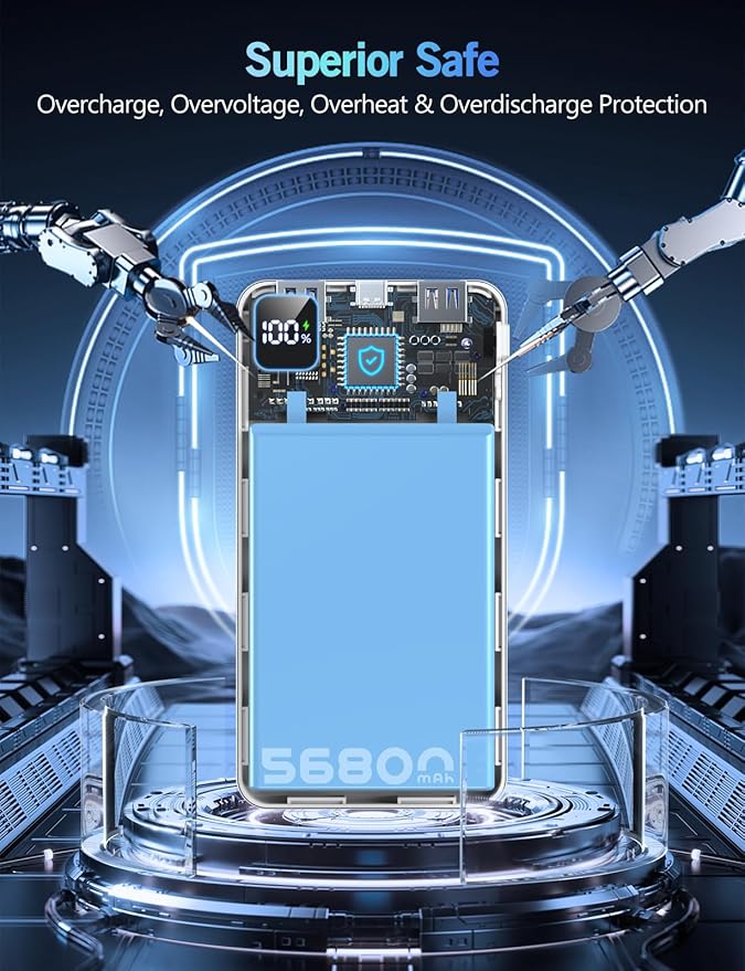 - 56,800mAh Ultra-High Capacity β Multi-Day Power Backup: Equipped with a massive 56,800mAh portable charger, this power bank ensures uninterrupted usage for days. It can keep your iPhone 16/15/14/13 series up to all day or keep a tablet powered for multiple full cycles. Ideal for camping, long-distance travel, or extended work trips where access to outlets is limited. Due to its extremely large capacity, this power bank cannot be carried on airplanes and is best suited for road trips, outdoor adventures, or emergency backup at home.