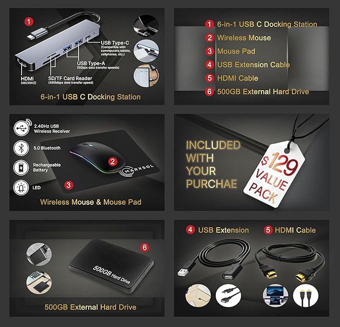 - 【Authorized MarxsolAccessory 】1 x SD Card reader, 1 x USB 2.0, 1 x Power connector, 1 x USB 3.2 Gen 1, 1 x HDMI, 1 x USB-C 3.2 Gen 1, 1 x Headphone / microphone combo jack (3.5mm); Webcam; Wi-Fi 6 and Bluetooth. Bundle includes 6-in-1 USB-C Docking Station Hub , HDMI cable, USB Cable, Mouse Pad, Wireless Mouse, and 500GB portable hard drive for your daily work and life.