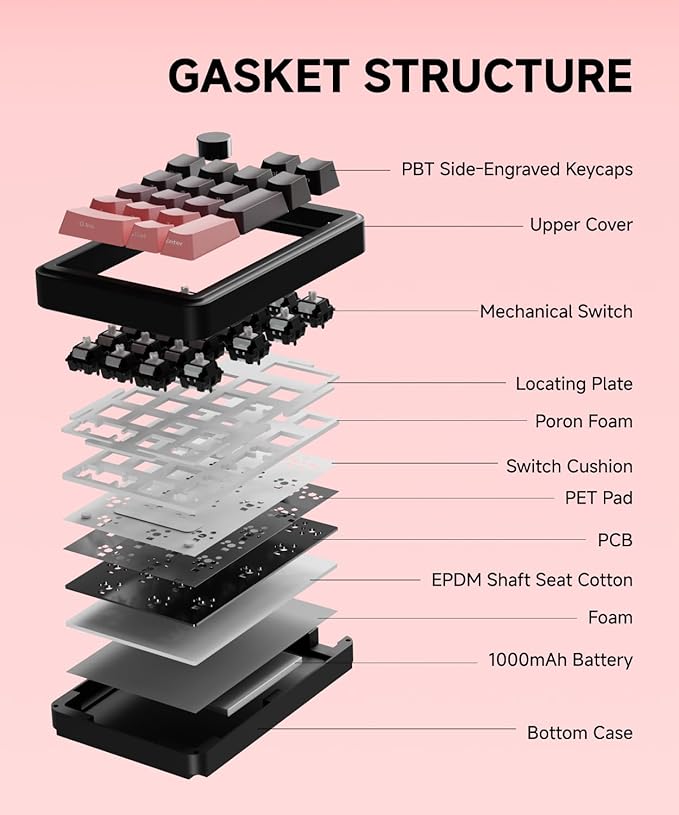 - 【Hot-Swappable Wireless Number Pad】: Mechanical numeric keypad uses a Gasket structure with multiple layers of soundproofing filling. Wireless numpad features a hot-swappable base, also includes three Baima Axis switches and a shaft puller, allowing you to replace 3 pins/5-pin Mechanical switches freely. Comes with Baima Axis switches, bringing you a comfortable and pleasant typing experience.