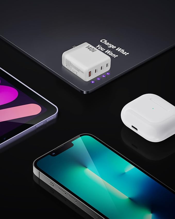 - 【4-in-1 Fast Charger】 Featuring 2 USB-C (140W PD),1 USB-C (30W PD) and 1 USB-A (22.5W QC) ports, the wall charger delivers a total output of 140W Max, enabling fast charging of up to four devices simultaneously with efficient power distribution. Perfect for phones, tablets, and laptops.When a single device is connected to one of the USB-C ports, it enjoys an impressive charge of up to 140W.