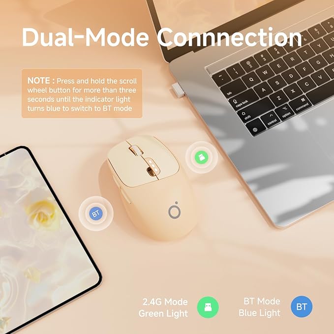 - Dual Connection: Connect two devices simultaneously using either Bluetooth/2.4G connection for a wireless mouse experience. Seamlessly switch between the connected devices with a simple slide of the switch button.