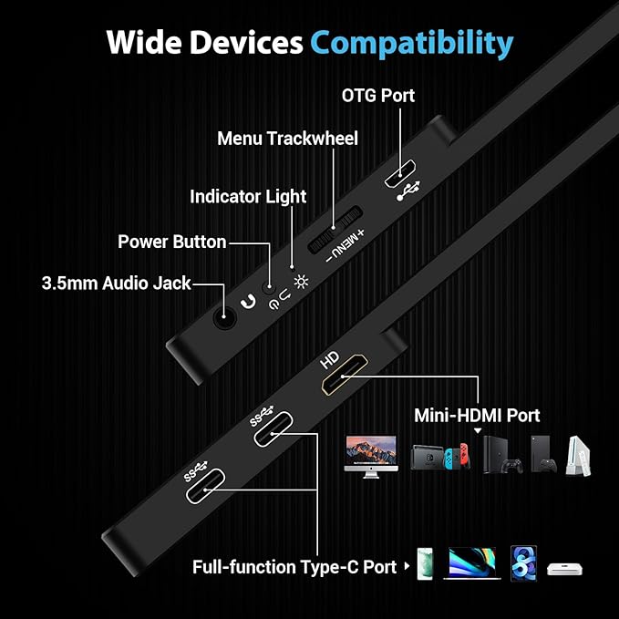 - USB-C HDMI Compatibility - With 2 full-function USB-C ports and 1 Mini-HDMI port, HotYeah 4K portable external monitor works seamlessly with laptop, MacBook, PC, phone, tablet, and game device like Switch, PS5/4, Xbox, Steam Deck, etc. Simply connect your device with single USB-C cable, and no more intricate cables! Just Plug and play, no driver or app. Note: Your device needs support Thunderbolt 3.0/4.0 or USB 3.1 Type-C DP ALT-MODE. The extra OTG port is for your wired keyboard or mouse.