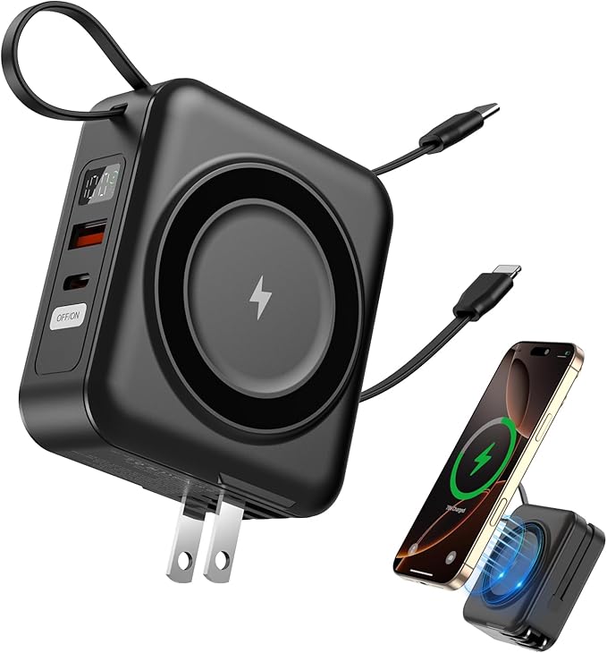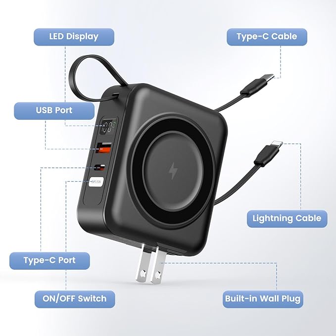 - 【15W Fast Wireless & 22.5W Wired Fast Charging】 10000mAh magnetic portable charger support 15W wireless fast charging, and 15W USB output port, 15W built-in iOS cable, 22.5W Type-C port and 22.5W built- in Type- C cable, compatible with Samsung, with iPhone, Android phone, AirPods and more devices. Perfect for Work, Travel, or Outdoor, enjoy a high-speed charging experience on the go! (Type C port and Type-C cable support input/output).