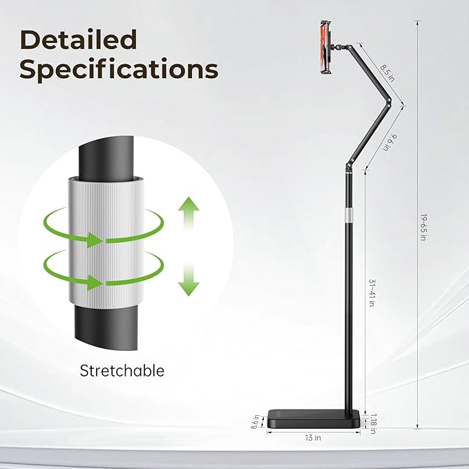 - 【Height & Angle Adjustable】Perfect your view: extend smoothly from 19 in (desk level) to 65 in (standing height). The telescopic arm offers full 360° horizontal rotation plus tilt adjustment for the tablet clamp. Achieve the ideal ergonomic position for comfort in any scenario, such as bedside use, overhead recording.