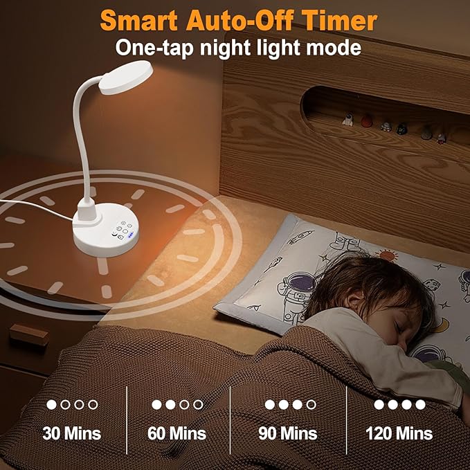 - Energy-Saving Timer & Night Light Mode – Set auto-off for 30/60/90/120 minutes plus one-tap night light mode for the lowest brightness. Perfect for bedtime reading, study sessions, or as a gentle nightstand lamp—saves energy and extends lamp life effortlessly.