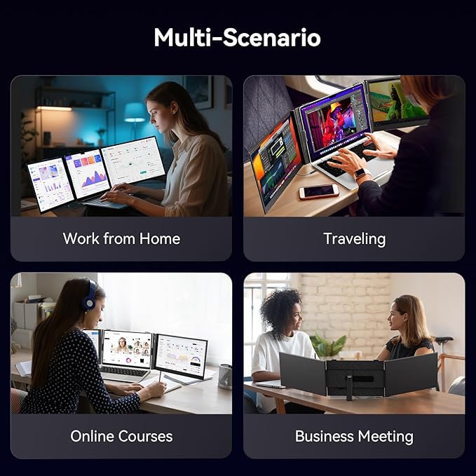 - Triple Screen Extender, 300% Efficiency - The portable monitor is an ideal triple-screen solution for laptops, letting you open multiple windows without constant switching and boosting efficiency by up to 300%. With this laptop screen extender, you can create a workstation anywhere, and perfect for presentations, multitasking, gamers, programmers, finance pros, designers, and anyone seeking smoother workflows.