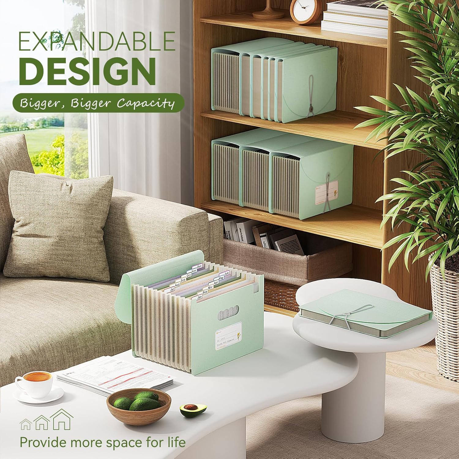Accordion File Organizer, 12 Pockets Wheat Straw Expanding File Folder, Portable Monthly Paper Bill Tax Receipt Organizer, Letter A4 Size Document Holder,Green Office with Colorful Tab,Mint Green