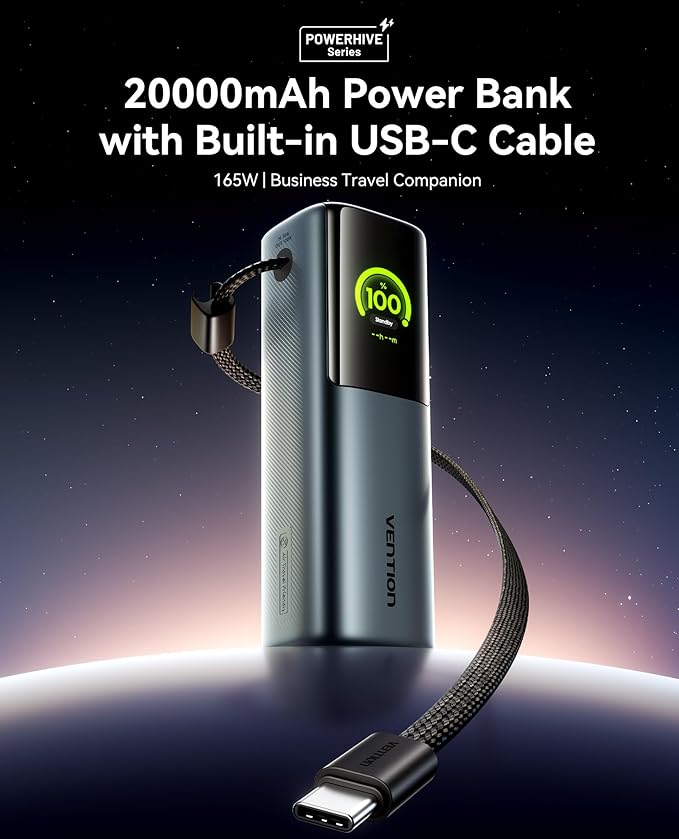 VENTION Powerhive Laptop Power Bank Fast Charging, 165W 20000mAh Portable Travel Charger, Digital Display & Emoji Animation, Integrated USB-C Cable for MacBook/iPhone 16/Galaxy S25 Ultra/Dell/HP