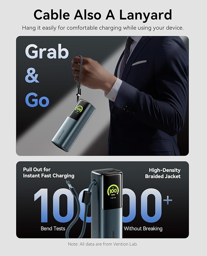 - [Built-In Cables for On-the-Go Use] - Includes two USB-C cables: one functions as a reinforced carrying strap, rigorously tested to endure over 20,000 bends beyond 60 degrees while supporting 2kg weight; the other delivers 240W high-speed charging for powerful, rapid power delivery anywhere.