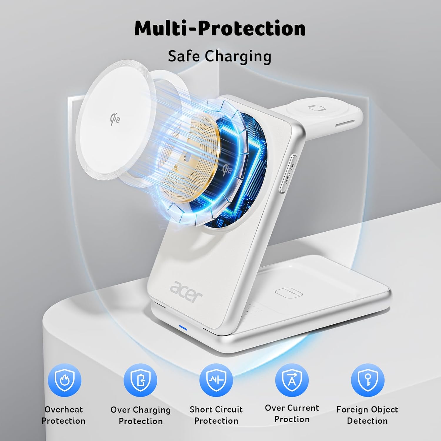 Acer Magnetic Wireless Charger, 3 in 1 Wireless Charging Station, 15W Fast MagSafe Charger for iPhone 16 15 14 13 12 Series -Apple Watch 10 9 8 7 6 5 4 3 2 SE and Ultra Series-Airpods 4 3 2 Pro Series