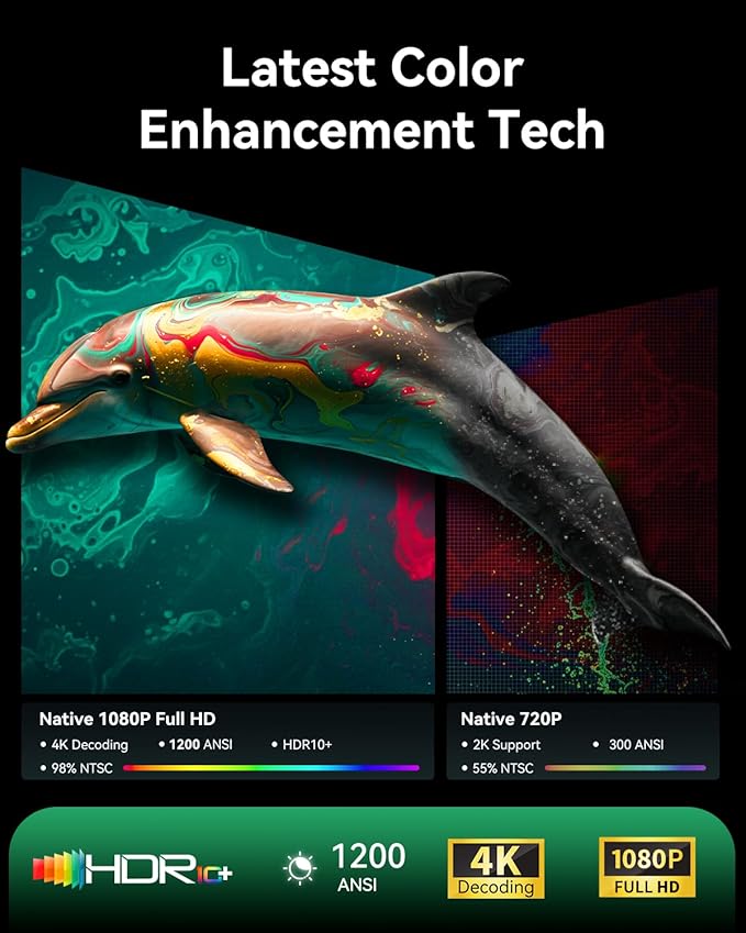 - [Native 1080P | 4K Supported]: Experience stunning clarity with the Aubor Mentech 4K projector. Featuring native 1080P resolution (1920×1080) and advanced LCD technology, it delivers sharp, vibrant, and true-to-life visuals. Compared to standard 1080P projectors, brightness is increased by up to 95%, ensuring clearer details and brighter images. With 1200 ANSI lumens of brightness and 98% NTSC color gamut, every color pops with richness and depth. Plus, HDR10 support boosts contrast and sharpness, making every scene more vivid. Whether you’re watching outdoors, at home, or in your backyard, enjoy a cinema-grade viewing experience like never before