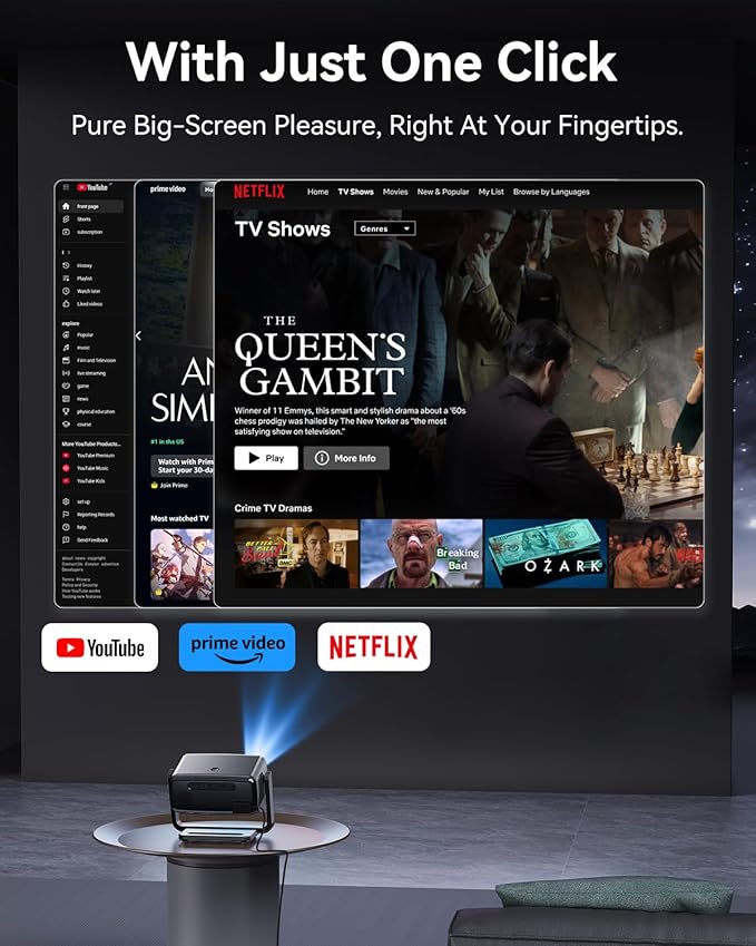- [Endless Entertainment - Built-in Smart OS with Official Streaming Apps]: This TV projector is deeply integrated with the global streaming ecosystem, offering direct access to Netflix, Prime Video, YouTube movies, and shows without the need for extra devices or adapters. Enjoy limitless exploration with regular OTA updates to ensure optimal performance, security, and functionality