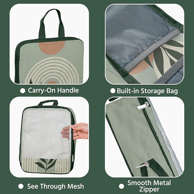 7 Pcs Compression Packing Cubes for Travel, Waterproof Suitcase Luggage Backpack Organizer with Toiletry Bag Travel Essentials for Women/Men-Green Bohemia