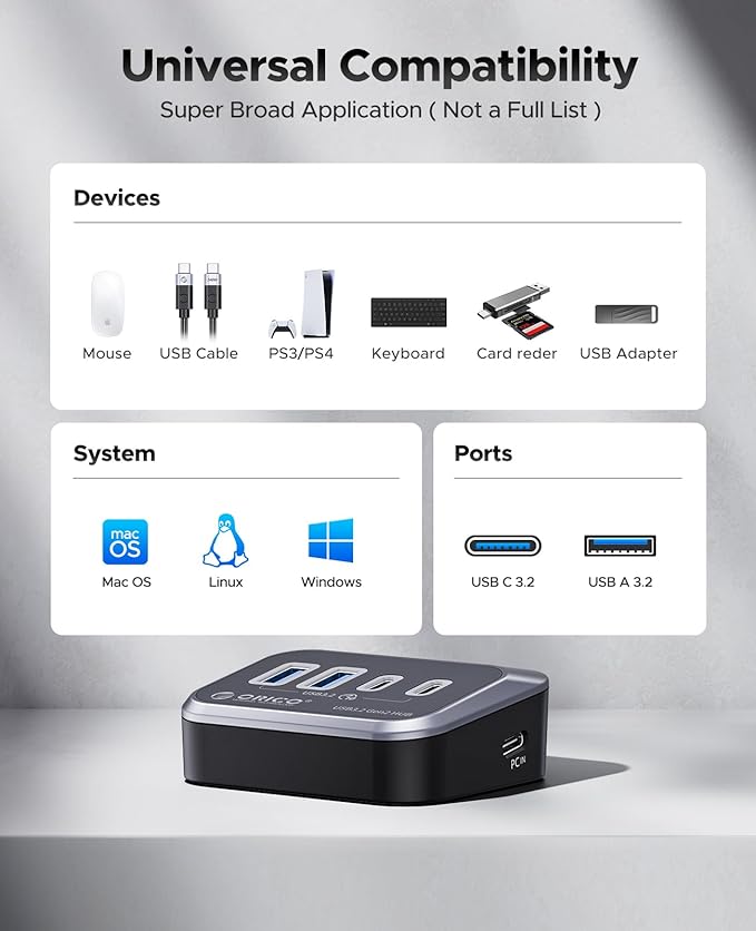- 【What You Get】1 x ORICO 4-Port USB 3.2 10G Hub, 1 x 3.28ft USB-C to USB-A/C cable; Important: This hub ONLY supports data transmission and does not support charging