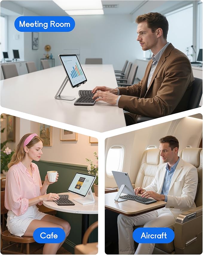 - Connection Modes and Wide Compatibility: Foldable keyboard supports Bluetooth connection and 2.4G wireless connection (2.4G USB receiver included). The connection distance is 10-15 m, stable and uninterrupted. The folding keyboard can connect 3 Bluetooth devices at the same time and easily switch between devices. Compatible with iOS, Android, Windows and Mac OS, it works perfectly with tablets, phones, laptops or PCs. Ideal for multi-device office users.