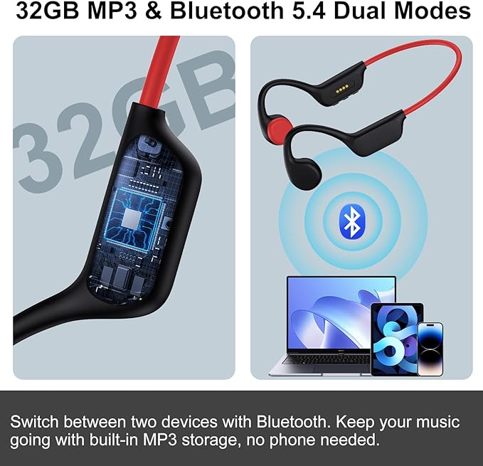 - 【32GB MP3 Player & Bluetoeth 5.4】Wireless Swimming headphones have dual-mode for switching, latest bluetoeth 5.4 and built-in 32GB TF memory card. Stable signal and fast connection. Whether you are swimming, running, cycling, hiking, driving, you can enjoy your favourite music anywhere. Open-ear headphones are designed for comfort and secure fit, ensuring stay in place during exercise, allowing you to enjoy music while you work out.