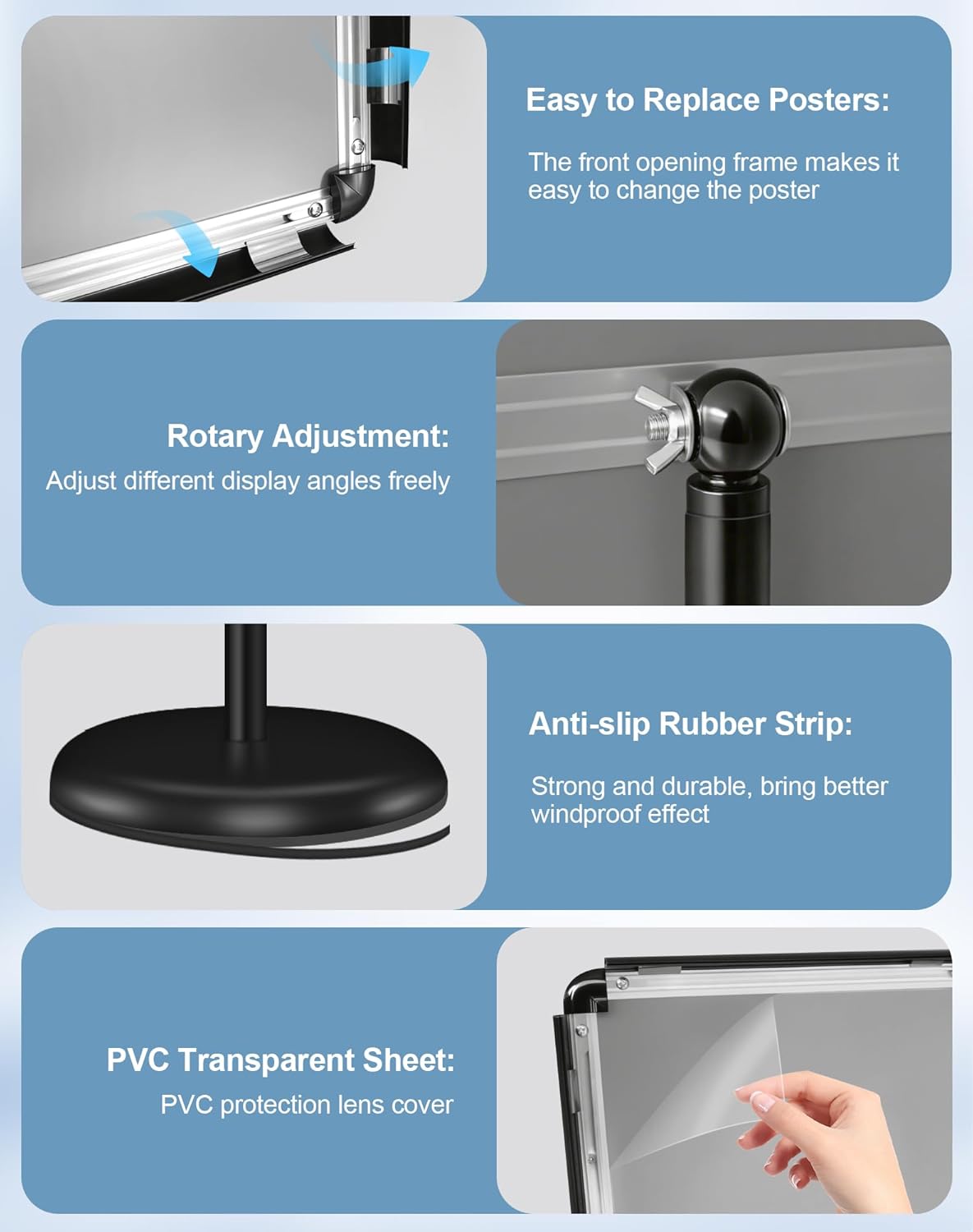 - Multiple Usage: Our poster holder stands are widely used for exhibitions, restaurants, schools, offices, retail stores and more, it stands firm on various hard surface, making it suitable for both indoor and outdoor use