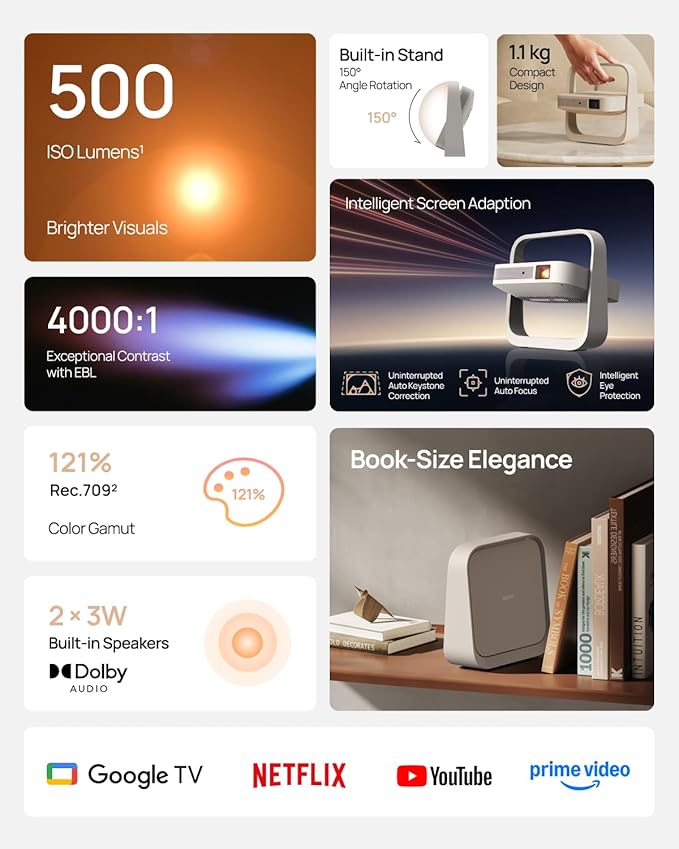 - Special Feature : Auto Focus, Google TV with licensed Netflix, 500 ISO Lumens 121% Rec.709 color, protable Book-Sized Movie Theater, Lightweight, Portable, portable compact size Auto Focus, Google TV with licensed Netflix, 500 ISO Lumens 121% Rec.709 color, protable Book-Sized Movie Theater, Lightweight, Portable, portable compact size