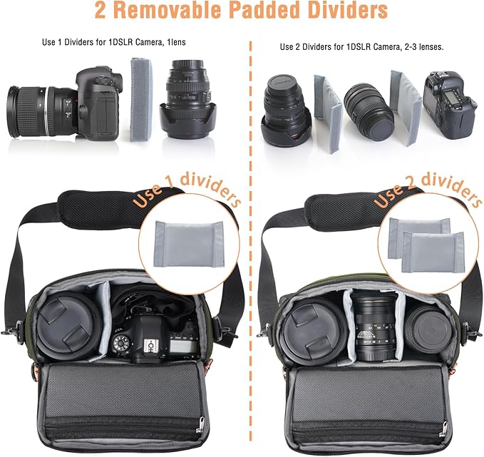 - Two removable modular inserts is designed as customized dividers for different cameras, flashes, lens and other camera equipments. Customer can adjust the inner space based on their needs. The soft foam layer surrounded can well protect your camera and accessories from accidental scratches, provide good buffer and protection to your internal stuff against bumps, shock and drops.