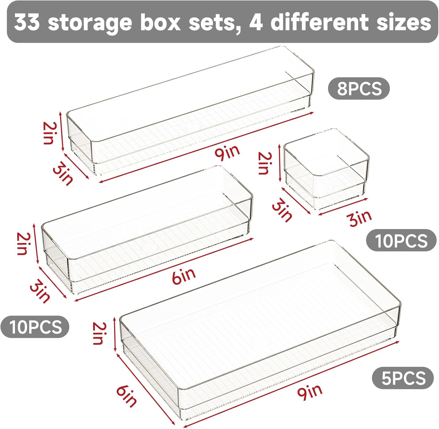 - Product Specifications:This set includes 33 storage boxes in 4 different sizes. Includes: 9 x 6 x 2 inches (5pcs), 9 x 3 x 2 inches(8pcs), 6 x 3 x 2 inches(10pcs), 3 x 3 x 2 inches(10pcs).
