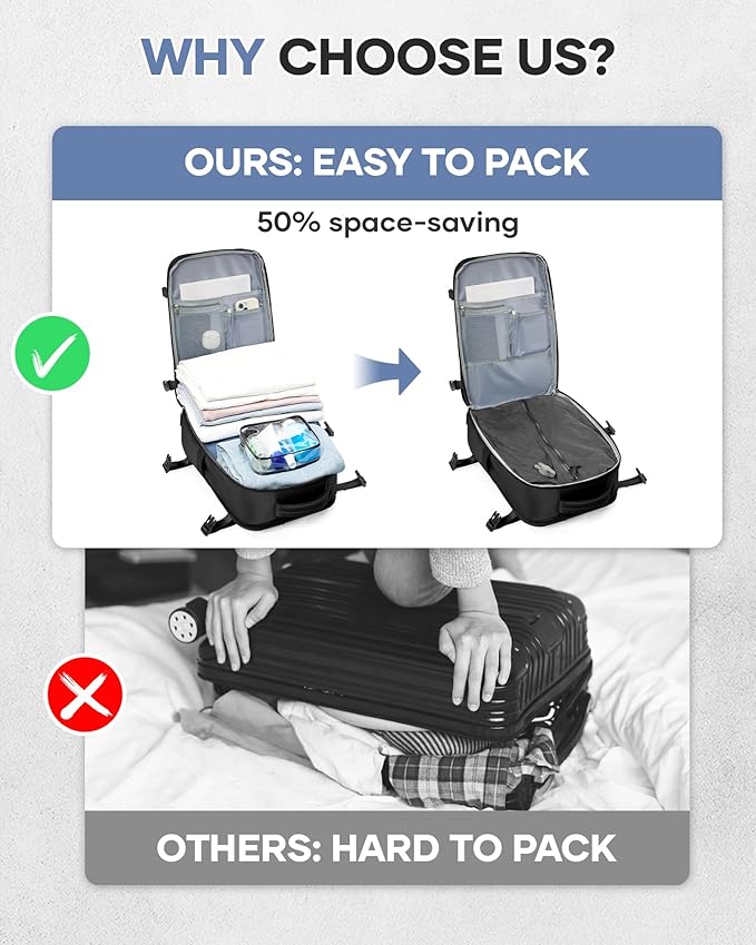 - 💎 Flight-Friendly - TSA-approved design speeds up security checks. The compression system fits 1-2 days' worth of luggage while complying with most airline carry-on size limits (fits under most airplane seats).