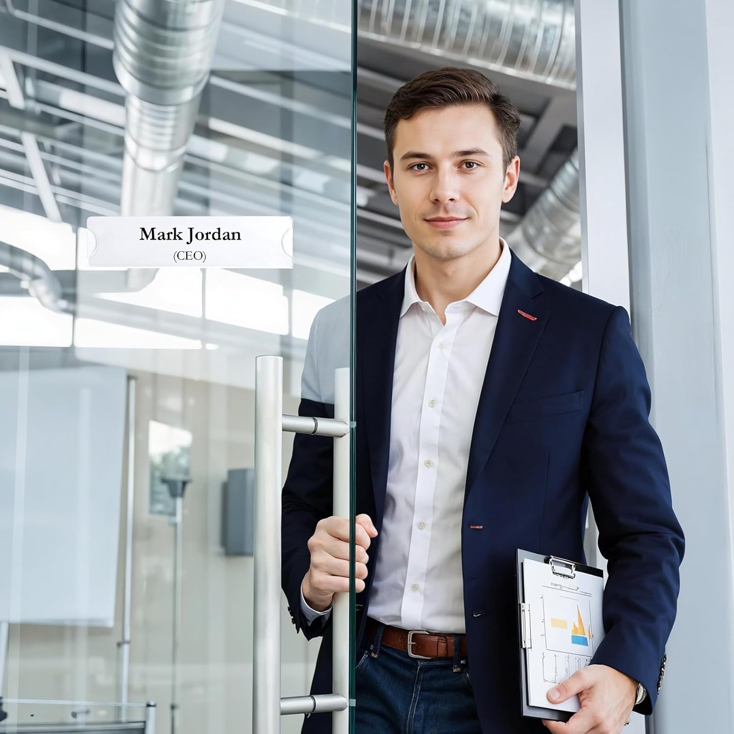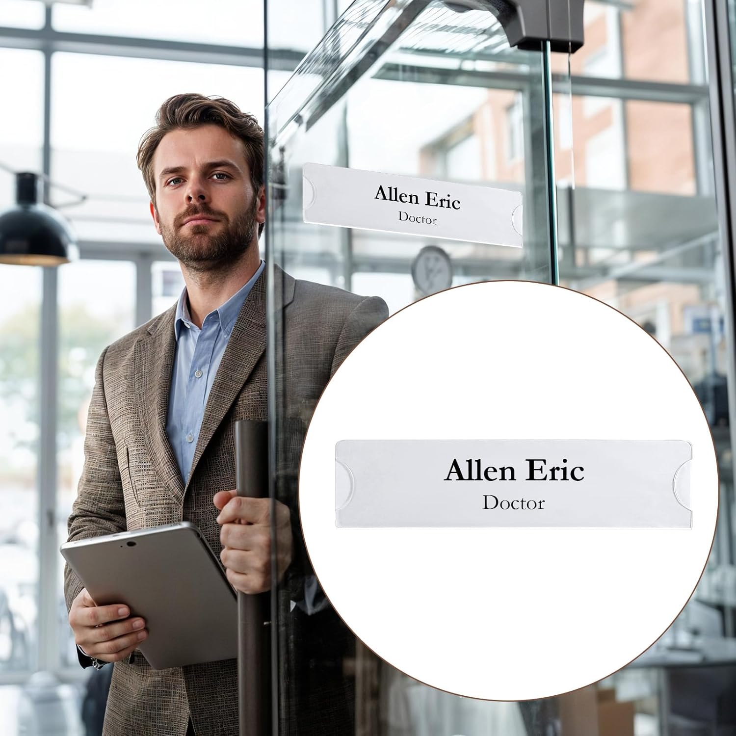 - Easy to assemble: stick the wall name plate on a clean and flat surface such as a glass wall with included double-sided adhesive tapes without drilling, interchangeable name tags for door saves time and gives you a neat and clean office look.