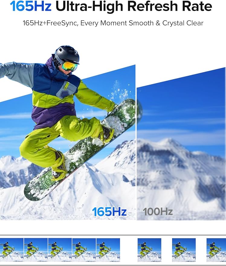 - 【165Hz for Ultimate Smoothness】165Hz ultra-high refresh rate gaming monitor, nearly three times smoother than regular 60Hz monitor and significantly reduces image trailing and tearing. Takeing you into a new realm of smooth and fluid visual.0.1ms ultra-fast response and FreeSync synchronization technology, enhance immersive gaming experience.